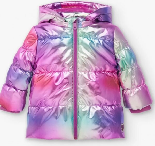 Piumino impermeabile dai toni multicolor. Presenta una chiusura frontale con cerniera e un cappuccio regolabile per proteggere dal freddo e dalla pioggia. Il design si distingue per il suggestivo effetto cangiante che cambia colore con la luce. Include una piccola toppa a forma di cuore sul bordo inferiore. Questo cappotto è perfetto per tenere il tuo bambino al caldo e con stile durante le giornate più fredde. Appartiene alla collezione Cyber Dino