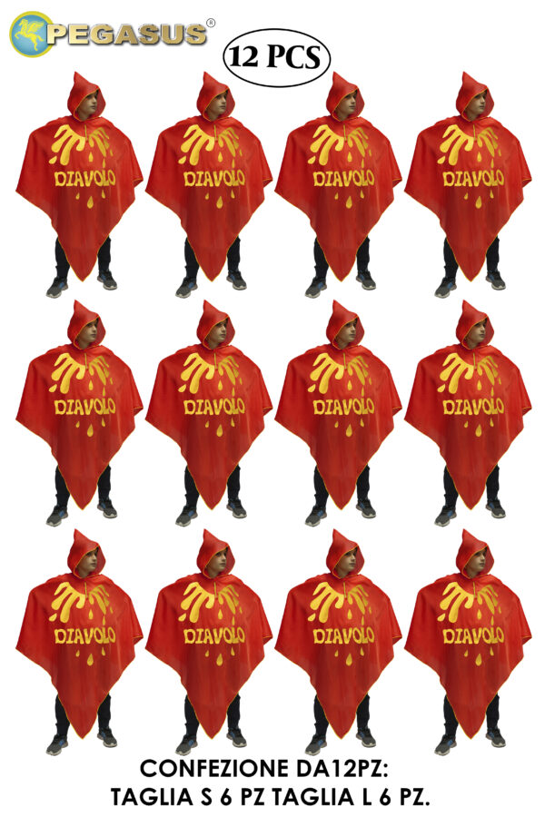 La Confezione da Poncho Diavolo rosso è composta da 12 pz.L’assortimento comprende 6pz. taglia S e 6pz. taglia L.Il Costume da Diavolo rosso è perfetto per le feste di compleanno, Travestimenti, Halloween, Carnevale, Cosplay, Giochi di finzione, giochi di ruolo e sfilate di carnevale.Design italiano: il nostro Costume con taglio a Poncho e cappuccio incorporato è orlato con taglicuce a contrasto giallo arricchito con fiamme e scritta diavolo stampato Materiale: tessuto 100% poliestereAvvertenze: indossare sotto visione di un adulto.Istruzione lavaggio: lavare a mano a bassa temperatura, lavare le parti separatamente, non strizzare, stirare a 110 gradi massimo a rovescio. OFFERTEACCESSORIHALLOWEEN, offertaaccessorihalloween