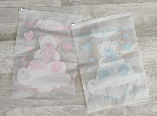 Cinque buste nascita con orsetto e scritta “Amore mio”, nuvoletta su cui poter scrivere il nome del bimbo e della mamma, sono perfette per portare i cambi in ospedale alla nascita del tuo bambino, con chiusura ermetica