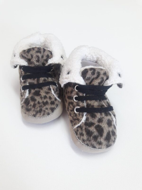 SCARPETTE NEONATA LEOPARDATE CON PELLICCIOTTO BIANCO ALL’INTERNO.