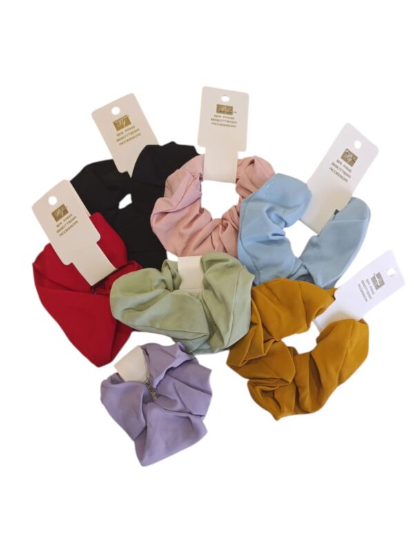Coloratissimi scrunchies in tessuto opaco, ideali per completare ogni look con un tocco di stile e praticità
