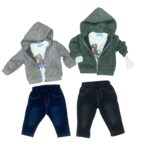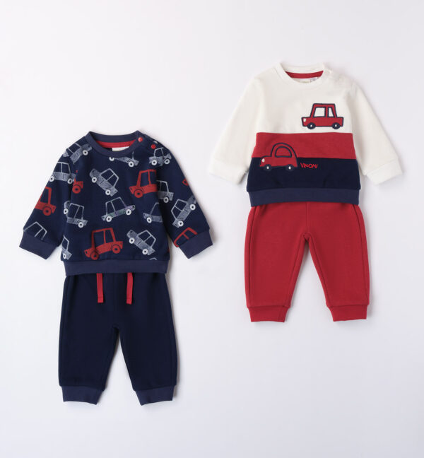 Tute jogging neonato due pezzi iDO 3-9 mesi realizzate in felpa invernale. Le felpe hanno apertura sulla spalla con bottoni a pressione per agevolare il cambio e la vestizione. I pantaloni hanno vita elasticizzata con coulisse e polsini sul fondo gamba.