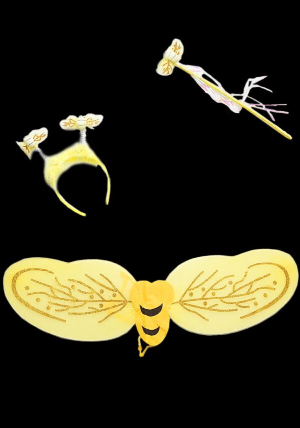 Il set ali apetta 3 elementi ? disponibile in taglia unica ed ? adatto per rendere unico il tuo costume.Il set ha h 26cm x l 78cm. APE, APETTA, APINA, ALI, CAPPELLOANIMALETTI, COMPLETO, GIOCO, INSIEME