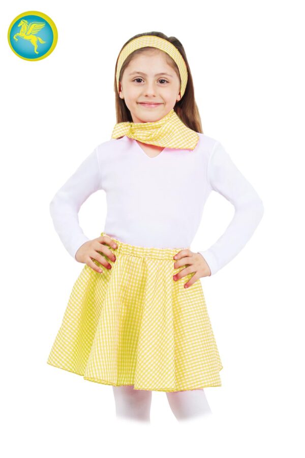 Il set anni 50 giallo bambina è disponibile in 3 taglie a partire dalla S 3/5 ANNI fino alla L 9/12 ANNI.Il set e composto da 3 elementi:gonna, fascia e foulard.