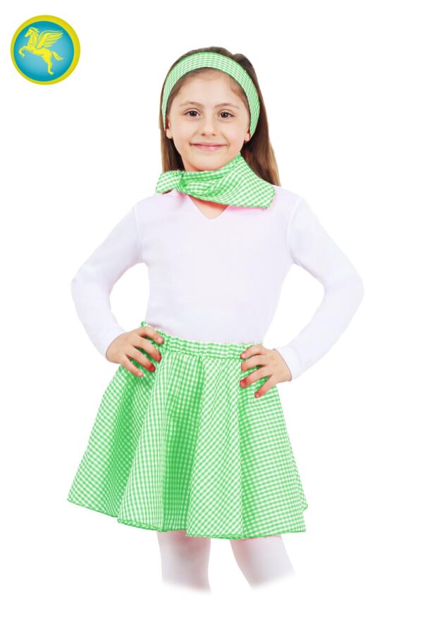 Il set anni 50 verde bambina è disponibile in 3 taglie a partire dalla S 3/5 ANNI fino alla L 9/12 ANNI.Il set e composto da 3 elementi:gonna, fascia e foulard.