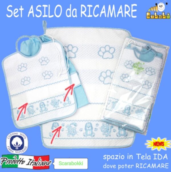 Set asilo composto da tre pezzi: tovaglietta, bavetta e sacchetto per portare il tutto.