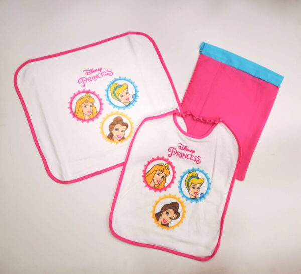 SET TRE PEZZI NEONATA PER ASILO COMPOSTO DA BAVETTA, SACCHETTO E TOVAGLIETTA CON STAMPE DELLE PRINCIPESSE DISNEY AURORA, CENERENTOLA E BELLE.