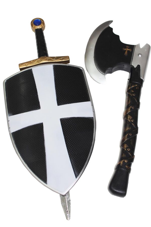 Il Set crociato è tra i prodotti più richiesti su Carnevale Pegasus.La Spada L 49 cm , scudo 20×30 cm, l’ascia L 43 cm CAVALIERI, CROCIATE, MALTA