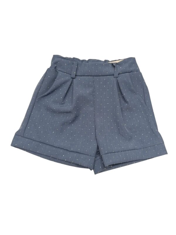 Shorts bambina blu avio con micro pois bianchi, dal taglio elegante e moderno.