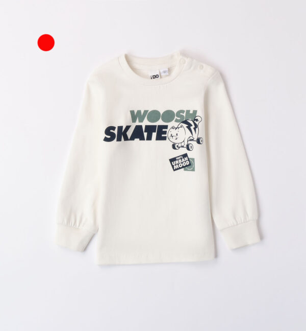 T-shirt in cotone bambino IDO,con apertura a bottoncini su spalla laterale sinistra e stampa gatto.