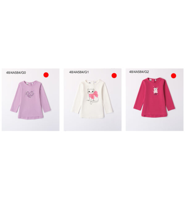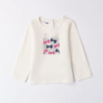 T-shirt in cotone a manica lunga,bambina IDO.Presenta scollatura a giro con apertura a bottoncini sul retro e diverse stampe sul fronte.