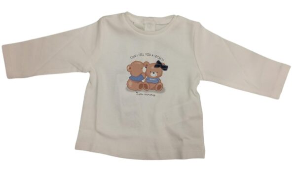 T-shirt neonata in cotone a manica lunga IDO.Si presenta con scollatura a giro,apertura con bottoncini a pressione sul retro e stampa frontale orsetti con dettaglio fiocchetto in rilievo.