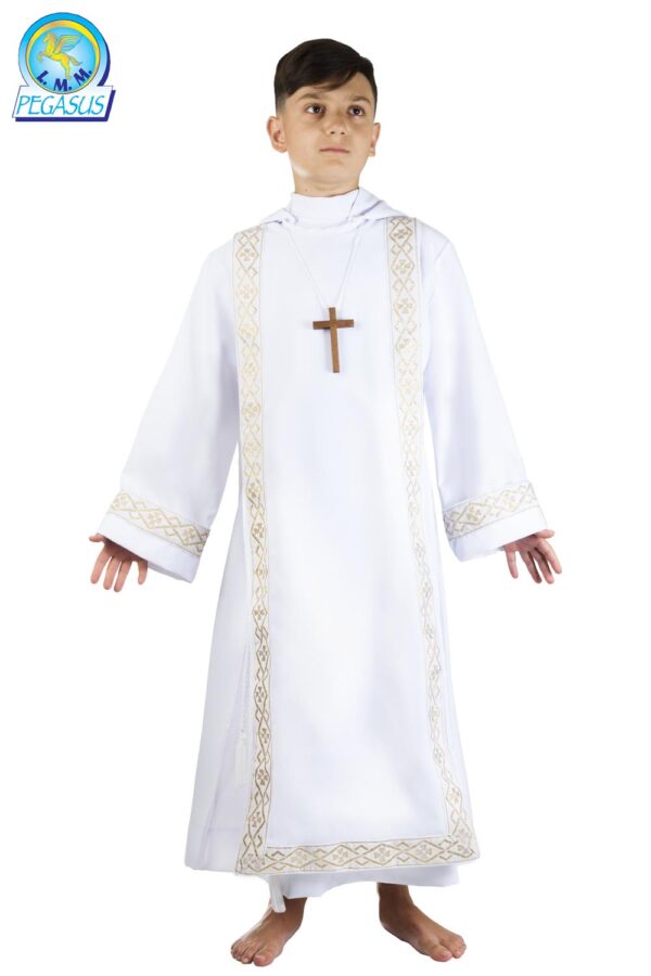 La tunica con cappuccio e scapolare prima comunione è disponibile in 8 taglie a partire da 100 CM fino a 140 CM.Tunica, cappuccio, cingolo, croce e scapolare con passamaneria dorata sul bordo.Tessuto: Tela100% Poliestere.Prodotto realizzato in Italia. PRIMACOMUNIONE, COMUNIONE, TUNICAPERCOMUNIONE, TUNICAPERCOMUNIONEBAMBINO, slideprimacomunione
