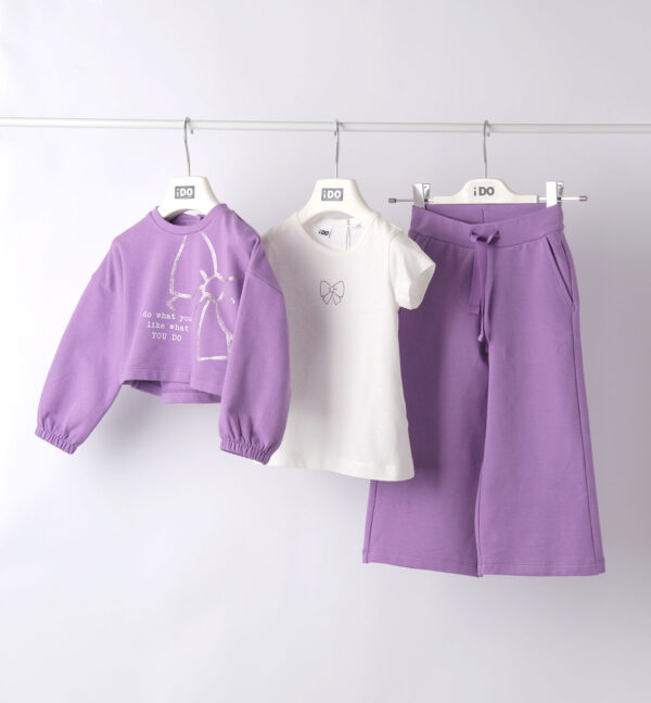 Tuta 3 pezzi bambina in cotone garzato IDO.E’composta da felpa crop,t-shirt e pantalone.La felpa crop presenta scollatura a giro con apertura a bottoncini sul retro,elastico ai polsini e stampa fiocco glitterato frontale.La t-shirt e’in cotone a mezza manica,con apertura a bottoncini sul retro e stampa fiocco frontale.Il pantalone e’a palazzo,tinta unita con coulisse in vita.