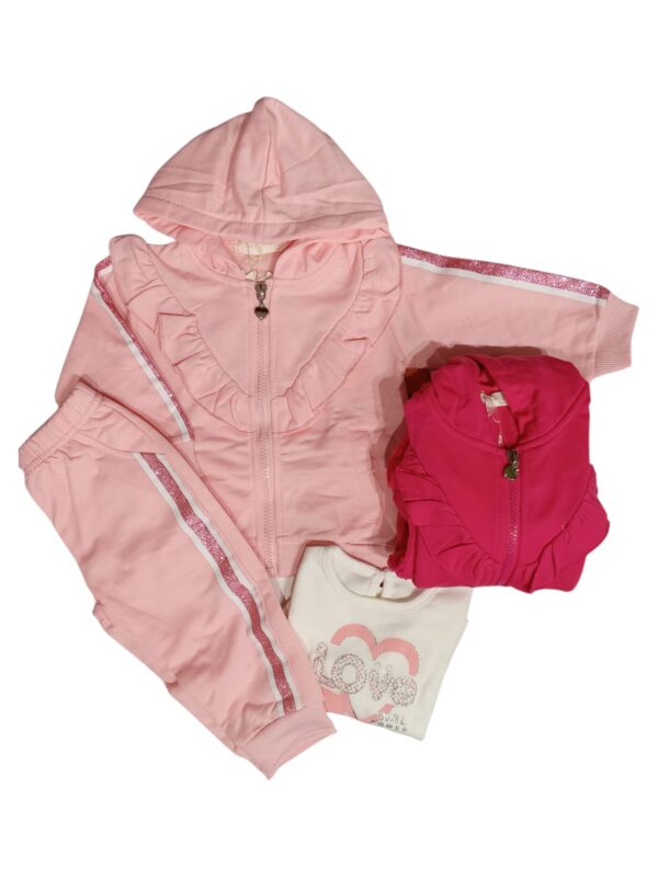 tuta 3 pezzi da bambina in morbido caldo cotone, con cappuccio rouge sul davanti decoro glitter sulle maniche.
