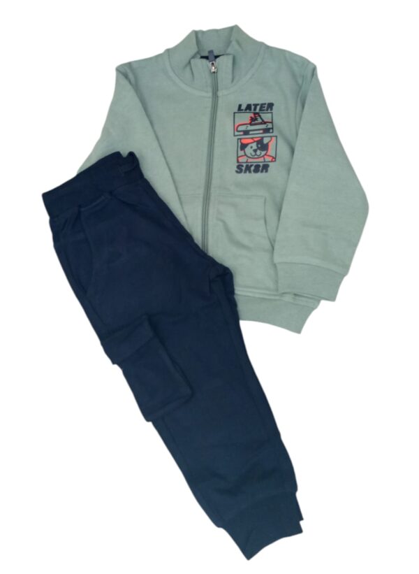 Tuta bambino IDO,in jersey pesante,felpato internamente.La felpa presenta apertura frontale con zip,fantasia tinta unita con stampa e tasca a marsupio.Il pantalone ha vita elasticizzata con coulisse,tascone laterale e polsini sul fondo.