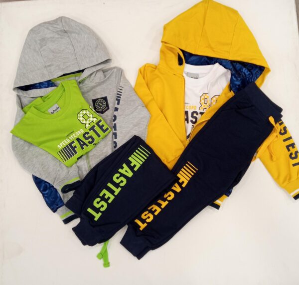 TUTA 3 PEZZI DA BAMBINO IN COTONE GARZATO CON CAPPUCCIO COMPOSTA DA GIACCA ZIP CON CAPPUCCIO. MAGLIA MANICA LUNGA, PANTALONE FITNESS CON POLSINO.