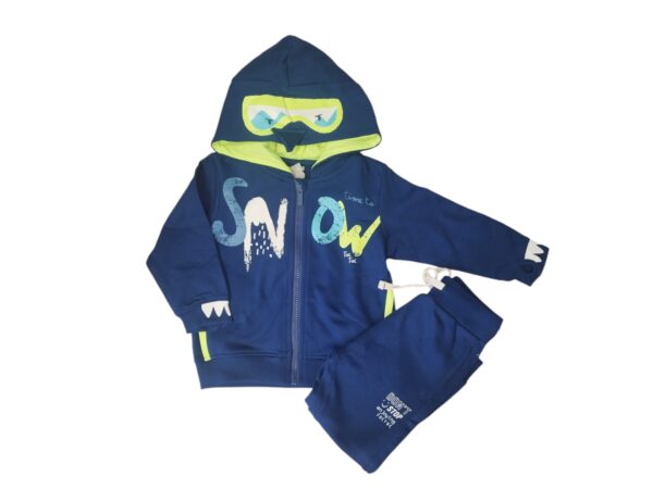 Set da bambino composto da una morbida felpa con cappuccio e pantaloni abbinati, entrambi in blu. La felpa presenta una chiusura frontale con cerniera, una tasca gialla con cerniera e una divertente stampa grafica con la frase ” snow time”. I pantaloni presentano una cintura elastica con coulisse regolabile , una piccola stampa che dice “Non smettere di goderti Tuc Tuc”. Questo set è ideale per offrire comfort e stile nella quotidianità. Fa parte della collezione freezy.