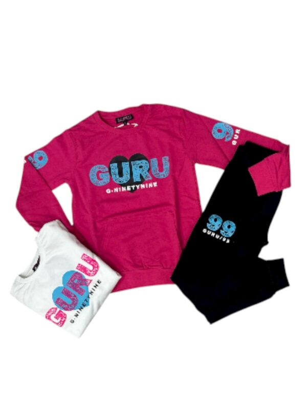 tuta in cotone garzato con stampa logo guru. pantalone in coordinato con polsino alla caviglia.