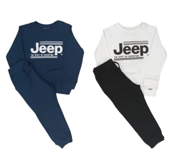 Tuta 2 pezzi bambino JEEP in cotone garzato.La felpa presenta scollatura a giro con apertura a bottoncini su spalla laterale sinistra,stampa frontale ed elastico ai polsini.Il pantalone a tinta unita presenta elastico in vita con coulisse ed elastico alle caviglie.