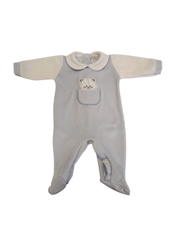 Pagliaccetto in ciniglia azzurro con maniche bianche e colletto tondo, perfetto per neonati.