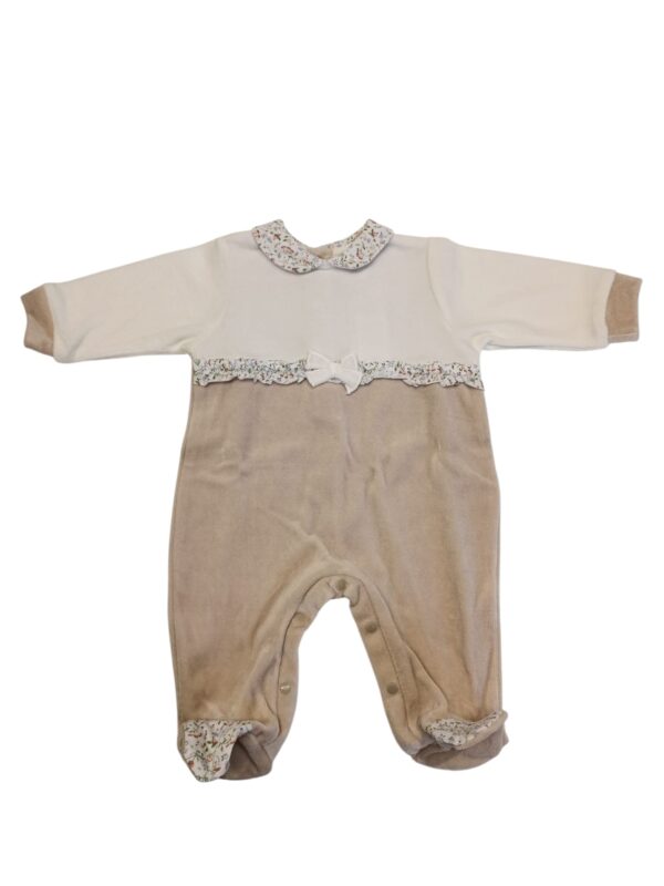 Delizioso pagliaccetto in ciniglia per neonata, con parte superiore panna e parte inferiore beige.