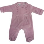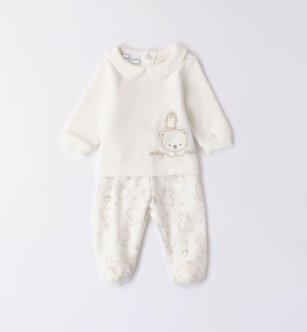 Tutina neonato/a 2 pezzi ciniglia.La maglia con lavorazione puntinata presenta scollatura a giro con colletto,apertura a bottoncini sul retro e ricamo orsetto e pinguino beige laterale in basso a sinistra.Il pantalone e’a fantasia orsetti e pinguini.