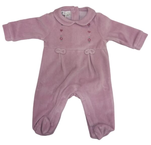 Tutina in ciniglia neonata IDO.Si presenta con scollatura a giro con colletto,apertura con bottoncini a pressione sul retro e nel sottogamba per facilitare il cambio pannolino e stampa frontale con applicazione di fiocchetti.
