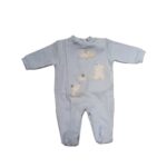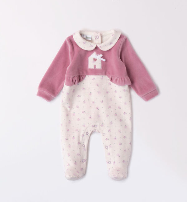 Tutina neonata in ciniglia IDO color malva con fantasia a fiori.Presenta scollatura a giro con colletto,apertura a bottoncini sul retro e nel sottogamba per facilitare il cambio pannolino e la vestizione,stampa frontale e volant laterale a meta’busto.