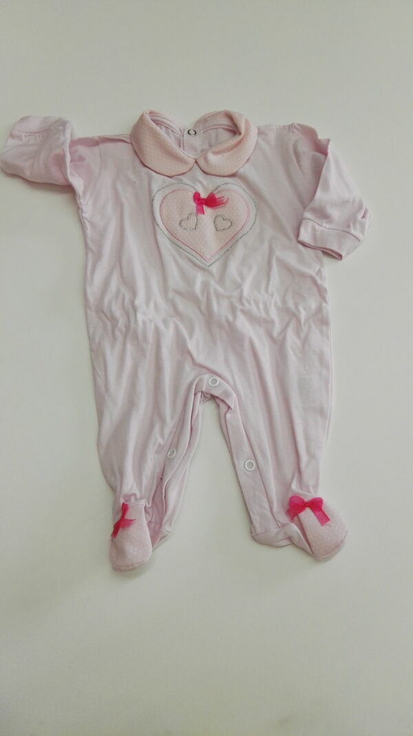 TUTINA JERSEY NEONATA CON COLLETTO, CUORE A FANTASIA RICAMATO, STRASS E FIOCCHETTO APPLICATI E FIOCCHETTI APPLICATI AI PIEDINI.