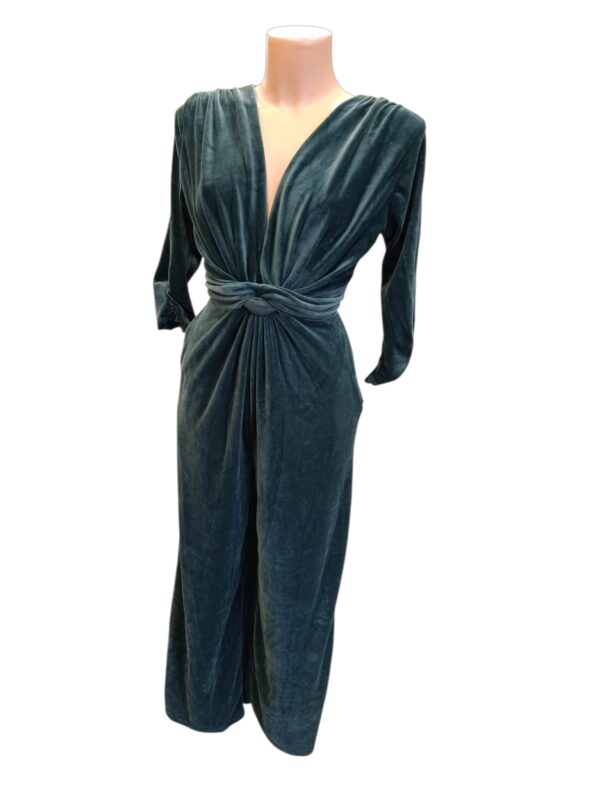 Tuta donna elegante in velluto liscio, caratterizzata da un raffinato colore verde petrolio. Modello con profondo scollo a V che valorizza il décolleté e maniche lunghe. La vita è evidenziata da un nodo centrale che crea un morbido drappeggio sul davanti, slanciando la silhouette. Pantalone a gamba ampia e fluida, per un effetto sofisticato e confortevole. Ideale per occasioni serali, eventi o look chic da cerimonia.