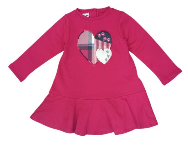 Vestitino in cotone felpato bambina IDO.Presenta scollatura a giro con apertura a bottoncini sul retro, stampa frontale con glitter e applicazione cuore in rilievo,in basso presenta una piccola balza.
