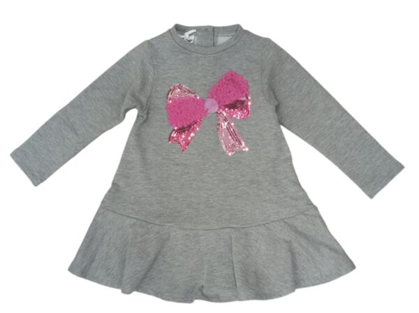 Vestitino in cotone felpato bambina IDO.Presenta scollatura a giro con apertura a bottoncini sul retro,applicazione frontale fiocco con pailletes e una piccola balza in basso.