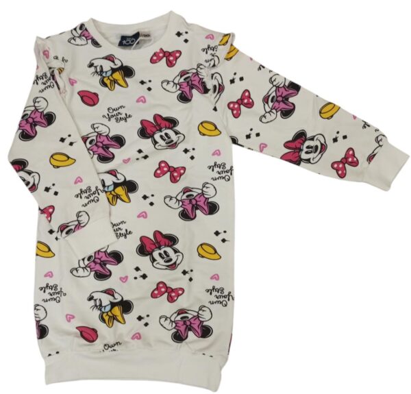 Vestitino longuette Minnie bambina iDO in cotone garzato.Si presenta con scollatura a giro ,elastico ai polsini e sul fondo,a fantasia Minnie sul fronte e sul retro con dettaglio rouche sulle maniche ad altezza spalle.