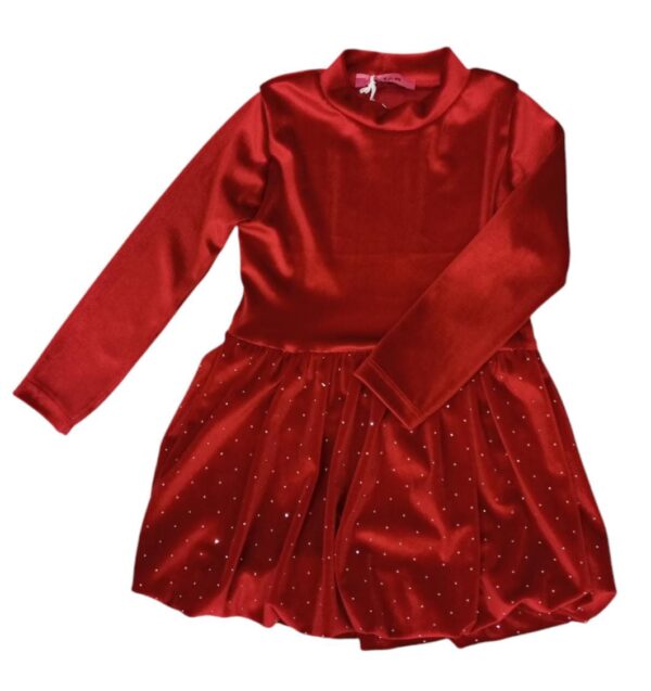 Vestitino bambina Io chica in morbido vellutino.Si presenta in tinta unita con scollatura a lupetto,modello a palloncino.Dalla vita in giu’e’tempestato da strassetti che donano all’abito quel tocco in piu’di eleganza.Adatto nel periodo natalizio,ottimo anche come idea regalo.