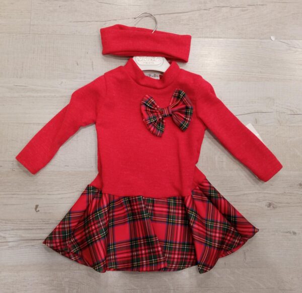 VESTITO BIMBA NEONATA CALDO COTONE MODELLOA CAMPANA CON GONNA FANTASIA QUADRETTONI E FIOCCO APPLICATO SUL PETTO, FASCIA IN COORDINATO.