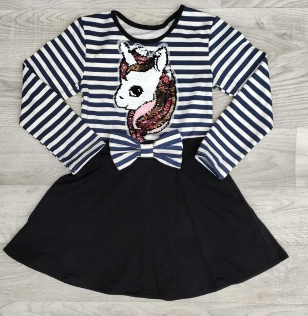 A RIGHE BLU E BIANCHE E STAMPA CON PAILETTES CON IMMAGINE UNICORNO