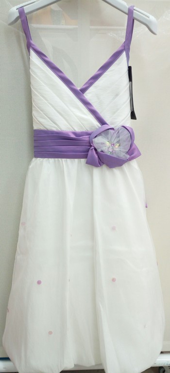 VESTITO CERIMONIA BIMBA CON SPALLINE STRETTE,CINTA LILLA CON FIORE E PUNTI LUCE APPLICATI,