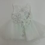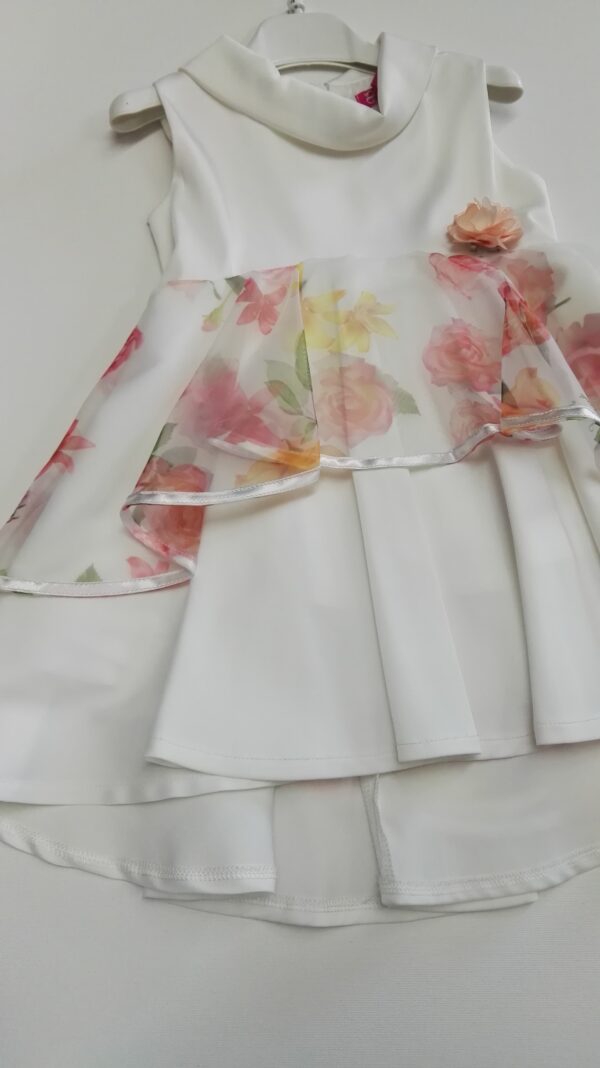 VESTITO DA CERIMONIA BIMBA, SMANICATO CON COLLO LARGO A RISVOLTINO, BALZA IN ORGANZA A FANTASIA FLOREALE APPLICATA AL PUNTO VITA E SPILLA CON FIORE IN TESSUTO. MODELLO CORTO DAVANTI E LUNGO DIETRO.