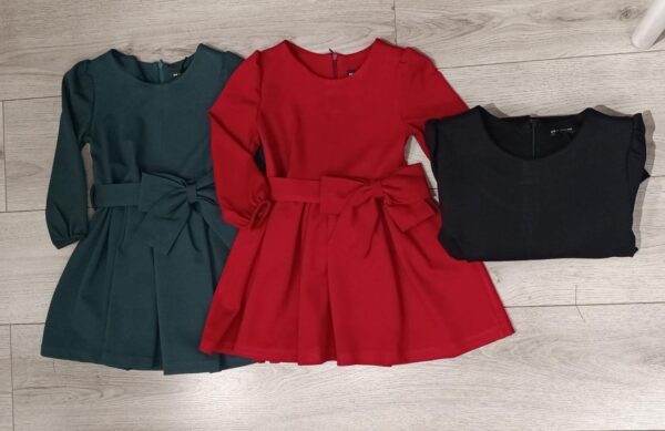 Abiti  da bambina dal design raffinato e femminile, caratterizzati da una gonna a pieghe morbide e da un nodo decorativo centrale sul davanti, che valorizza il punto vita. Il taglio è svasato, comodo e ideale per garantire libertà di movimento. Realizzati in tessuto liscio e strutturato, perfetti sia per occasioni speciali che per eventi più eleganti.Disponibili in tre varianti colore:Verde bosco intensoRosso vivaceNero classicoUno stile sobrio ma ricercato, adatto a cerimonie, feste o outfit curati da giorno.
