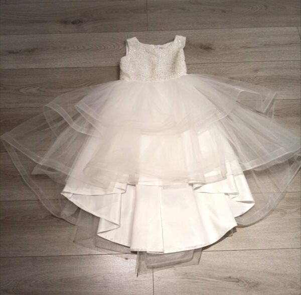 Smanicato, il capo presenta un corpetto di paillettes, un gonnellone in tulle e una chiusura zip.