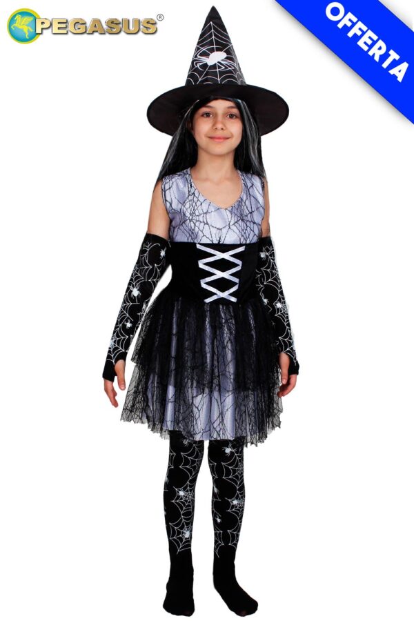 Il costume Spiderella è disponibile in 3 taglie a partire da 7/8 anni fino a 11/12 anni. Il costume confezionato nel sacchetto copriabito presenta i seguenti elementi: cappello, vestito, calze e guanti.Il Vestito da Spiderella è perfetto per le feste di Compleanno, Travestimenti, Halloween, Carnevale, Cosplay, giochi di finzione, giochi di ruolo e sfilate di carnevale.Design Italiano: il nostro Costume presenta il corpetto smanicato in ciniglia di colore nero decorato nella parte bassa da nastrini di raso in bianco, la parte alta del vestito è invece realizzata in fodera bianca con merletto nero, gonna in fodera bianca sovrapposta da due stradi di merletto, a balze, con stampa ragnatele il tutto abbellito da guanti, calze e cappello di colore nero con stampa ragnatele.Materiale: tutte le parti 100% poliestereAvvertenze: indossare sotto visione di un adultoIstruzione Lavaggio: lavare a mano a bassa temperatura, lavare le parti separatamente, non strizzare, stirare a 110 gradi massimo a rovescio streghe, fiabe, malvagie, OFFERTA, OFFERTACOSTUMIHALLOWEEN