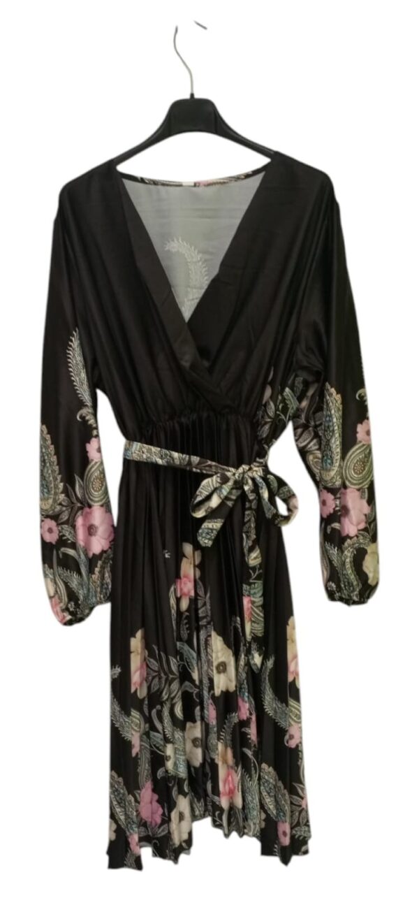 Vestito donna plissettato.Si presenta con scollatura a V,a fantasia floreale,leggermente ampio sul fondo e lunghezza ad altezza polpaccio.E’dotato di cinturino in stoffa ed e’in taglia unica.