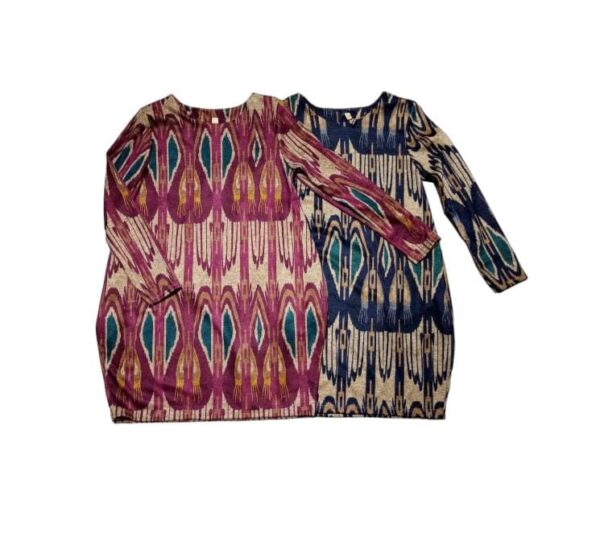 Il capo, in fantasia, presenta un girocollo, delle maniche lunghe e due tasche laterali.