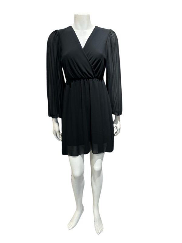 Abito corto nero da donnaAbito corto in tessuto leggero e fluido, ideale per occasioni serali o eventi speciali. Il modello presenta una raffinata scollatura a V incrociata che valorizza il décolleté, mentre la vita elasticizzata definisce la silhouette garantendo comfort e vestibilità. Le maniche lunghe leggermente arricciate donano un tocco romantico e femminile. La gonna morbida con orlo delicatamente trasparente aggiunge movimento e sensualità al capo. Un abito versatile, perfetto da abbinare a décolleté o stivaletti per un look chic e senza tempo.