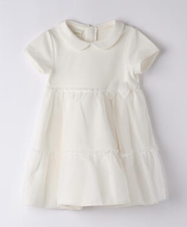 Abito iDO per neonata realizzato in felpa stretch di cotone garzata internamente. Pesantezza invernale. Il modello ha ampia gonna in tulle e piccolo fiocco sul punto vita. Apertura dietro con zip invisibile