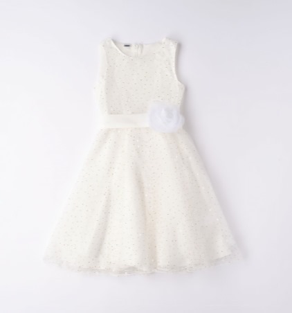 Abito smanicato per bambina iDO realizzato in tulle con gonna a pois brillantinati in oro foderato in cotone.