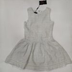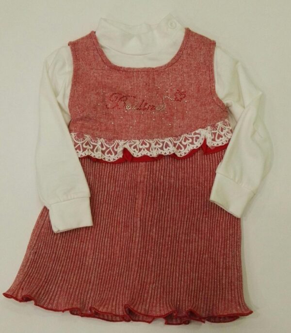 VESTITO NEONATA DUE PEZZI. LUPETTO BIANCO CON BOTTONI LATERALI, SCAMICIATO CON COLORE IN PREVALENZA CORALLO, RICCETTO IN VITA ROSSO E PIZZO LAVORATO BIANCO. SCRITTA DI STRASS SUL PETTO, E GONNA MORBIDA PLESSETTATA.
