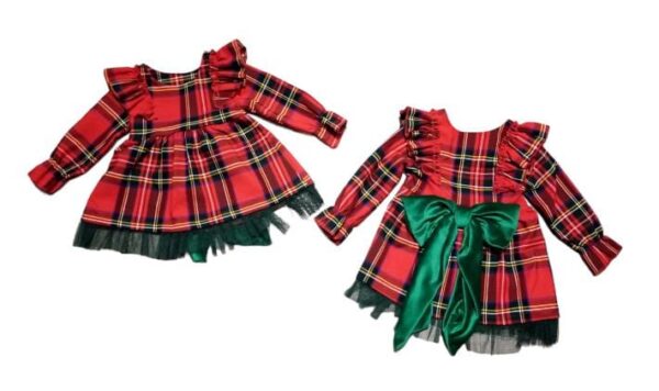 Il vestito presenta una fantasia in tartan, con dettaglio di volat sul petto e fioccop in ciniglia dietro.